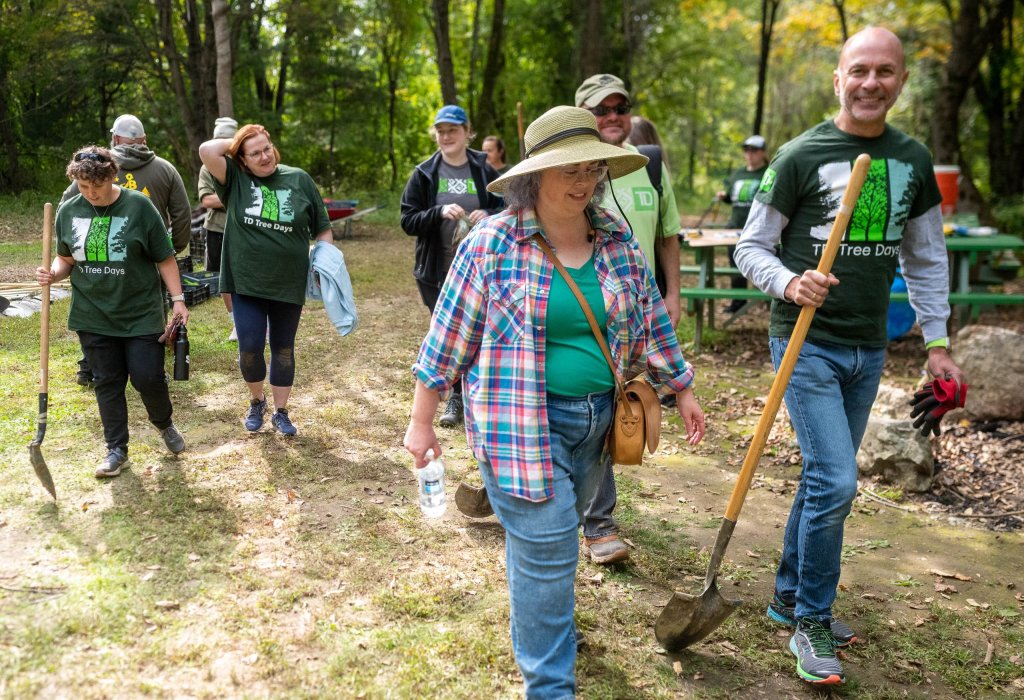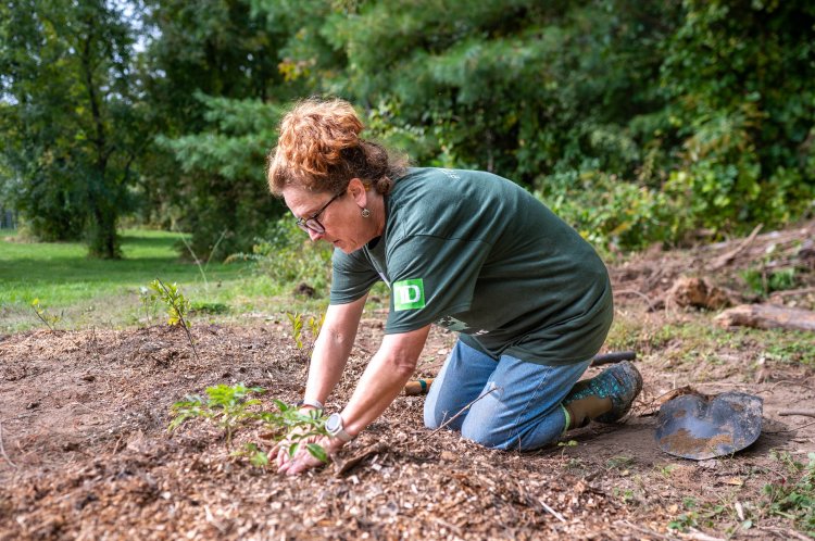 Mary Bunnell, a TD bank volunteer, moves mulch Friday around an elderberry shrub she planted at the YMCA Outdoor Learning and Education Center on Stetson Road in Auburn. TD Bank selected ReTreeUS to receive the 2023 TD Tree Days grant, a community-based program that expands urban forests and green spaces in primarily low-to-moderate income neighborhoods. The grant allowed ReTreeUS staff, YMCA staff and TD Bank volunteers to plant 40 fruit trees and 125 fruit and nut shrubs. Andree Kehn/Sun JournalSome of the more than 75 TD Bank volunteers finish up a morning of tree planting Friday at the YMCA Outdoor Learning and Education Center on Stetson Road in Auburn. TD Bank selected ReTreeUS to receive the 2023 TD Tree Days grant, a community-based program that expands urban forests and green spaces in primarily low-to-moderate income neighborhoods. The grant allowed ReTreeUS staff, YMCA staff and TD Bank volunteers to plant 40 fruit trees and 125 fruit and nut shrubs. Andree Kehn/Sun Journal