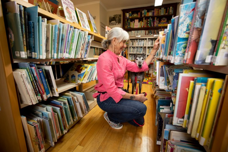The greyhound Annie comes to story time on Mondays at 10 a.m. at Bethel Library. Rose Lincoln/Bethel CitizenJan Zulkeski of Andover and her greyhound Annie look for books for story time, held on Mondays at 10 a.m. at Bethel Library. Rose Lincoln/Bethel Citizen