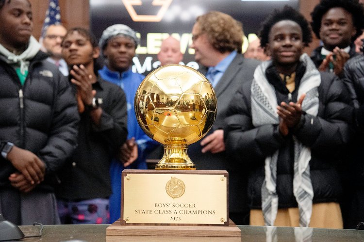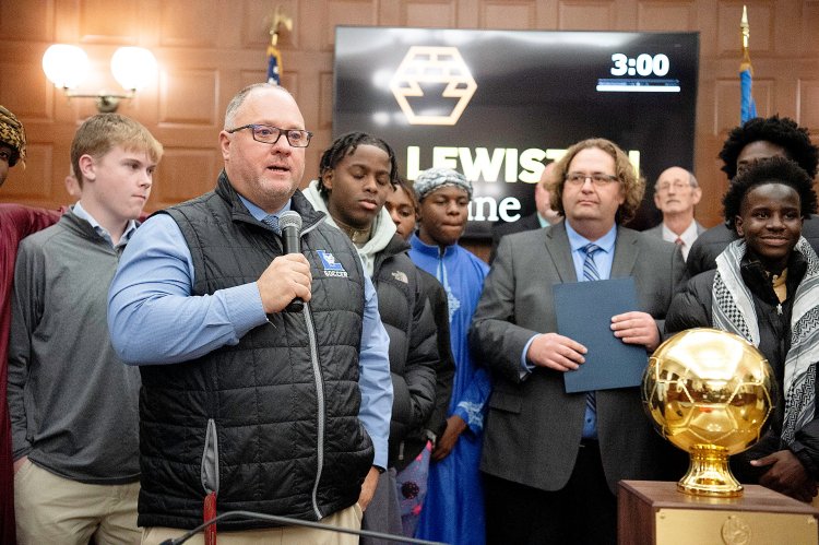 Lewiston High School boys soccer coach Dan Gish speaks about winning the Class A State Championship after his team was recognized by Lewiston mayor Carl Sheline, third from right, and the city council Tuesday at City Hall. The Blue Devils were recognized on a night when over 20 community organizations were thanked by the council for the help they provided during the mass shooting of Oct. 25. The Devils had just won a playoff game against Mt. Blue High School when the team heard about the shootings. “This gold ball is for the community of Lewiston,” said Gish. Daryn Slover/Sun JournalLewiston Mayor Carl Sheline and the Lewiston City Council recognize the Lewiston High School boys soccer team Tuesday at City Hall in Lewiston. The Blue Devils beat Deering High School 3-2 in overtime to bring the gold ball back to Lewiston. “This gold ball is for the community of Lewiston,” said head coach Dan Gish. Daryn Slover/Sun Journal