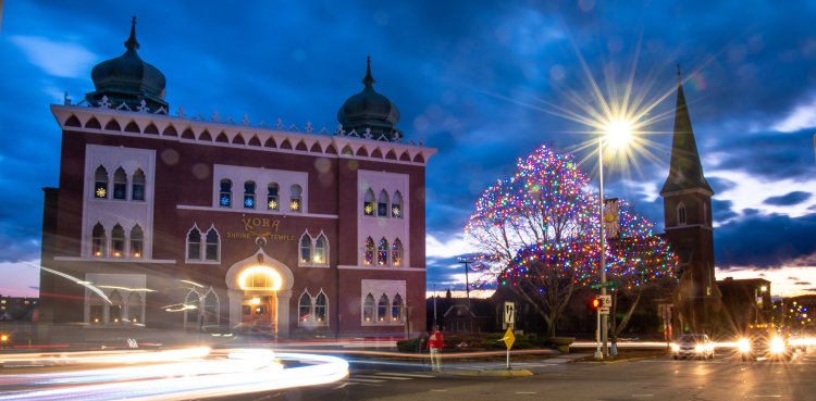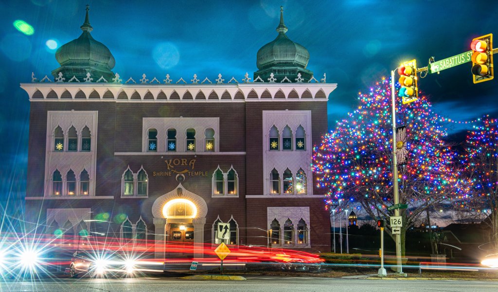 The Kora Temple in Lewiston is decked out Monday for the holidays as the lights from cars passing along Main Street are seen in a time lapse photo. The temple’s annual FEZtival of Trees concluded over the weekend and the tree winners were announced Sunday. The list can be found at www.facebook.com/feztivaloftreez. Russ Dillingham/Sun JournalThe Kora Temple in Lewiston is decked out Monday for the holidays as the lights from cars passing along Main Street are seen in a time lapse photo. The temple’s annual FEZtival of Trees concluded over the weekend and the tree winners were announced Sunday. The list can be found at www.facebook.com/feztivaloftreez. Russ Dillingham/Sun Journal