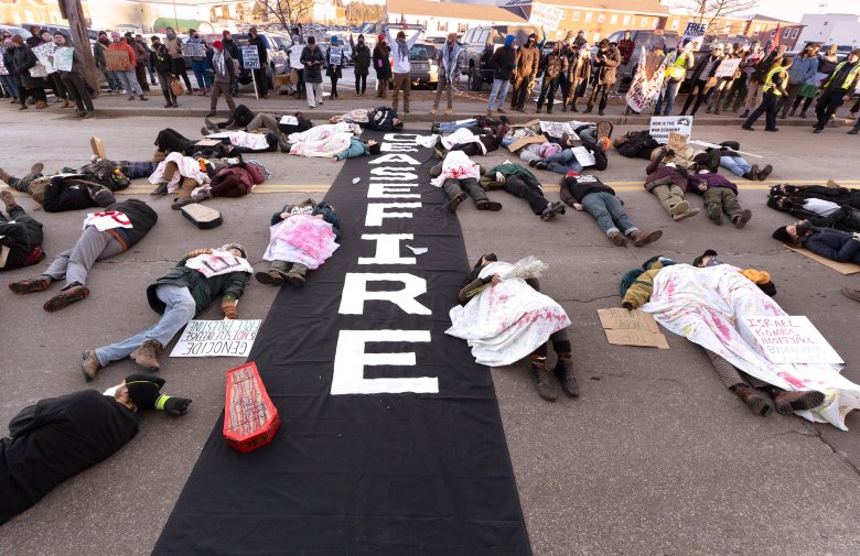 Dozens lay prone on cold asphalt, wrapped in sheets splashed with red paint, to block cars trying to leave the shipyard, while others chanted, calling for Israel to end its occupation of the Gaza strip.