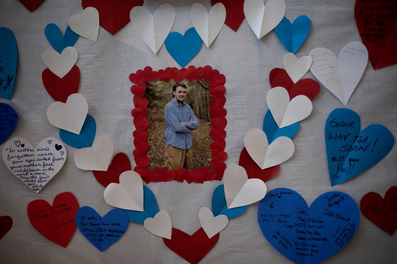 In the school’s front hall – just past a “Sumner Strong” sign scrawled in blue marker on a whiteboard – red, white, and blue paper hearts offer memories and messages for Cole’s family: