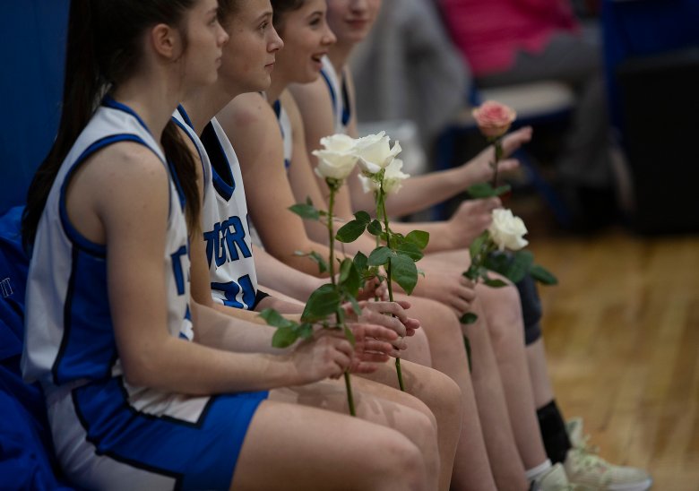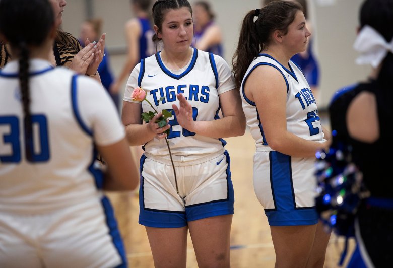 Once introduced, each player walked across the gym to the spot where Holly Merchant sat surrounded by her family. One after another, she squeezed them in tight hugs as they handed her their flowers.