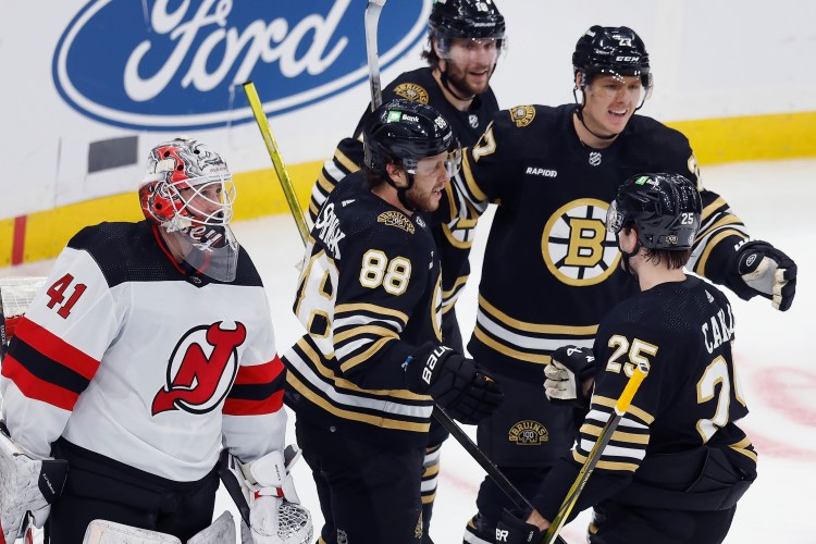 Boston star defenseman Charlie McAvoy left the ice late in the game, favoring his left leg, after crashing into Ullmark while hustling back on a Devils 2-on-1 break.