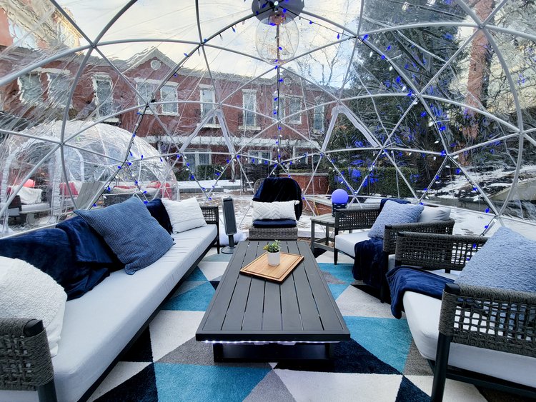 Located on the fourth floor of the hotel, on Hancock Street in the Old Port, Alto this winter began offering two igloos on the terrace for dining. Like so many of the so-called “igloos” or “snow globes” at area eateries, they are large bubble-shaped structures made of PVC-type piping and covered with a see-through plastic. Inside are space heaters, and a zippered door keeps the cold air out. The igloos seat six, and blankets are available, plus there are Bluetooth speakers, so you can create your own musical ambience. Reservations are required, and there’s a $75 fee to use the igloos for 90 minutes, though there’s no minimum drink or food purchase required.