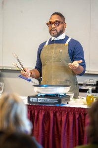 Between cooking, and sometimes while stirring a pan, Terry offered thoughts on a wide variety of food-related issues, from what he called “food apartheid” that squeezes poor Americans to the growing popularity of plant-based, corporate-created alternatives to meat.