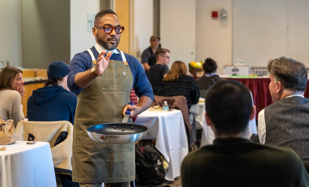 “My grandmother could work magic in the kitchen,” he told hundreds of people gathered in Gomes Chapel for a keynote address Monday. “My fondest recollections of being in the kitchen involved spending time with my maternal grandmother, from whom I gained a love of cooking.”