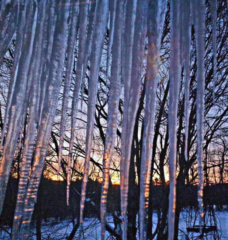Reflections from the rising sun are captured Tuesday morning, Jan. 9, in North Jay. With rising temperatures, the frigid strands dripped away overnight. Submitted photo