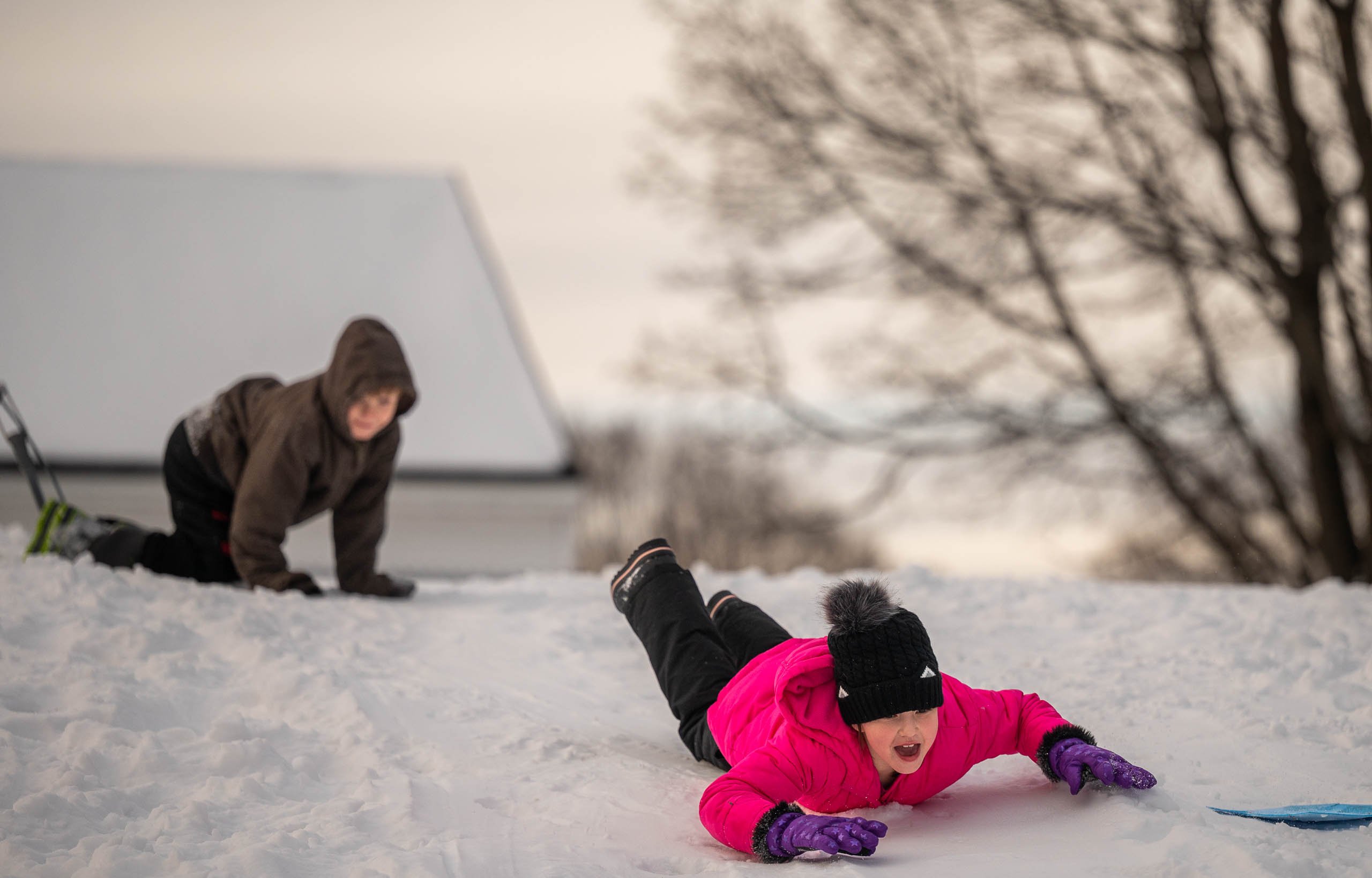 Cheyenne Murphy, 9, slides down a hill Friday next to the Troy Barnies Basketball Court in Auburn. Her cousin, Jamison Jackson, 7, watches her from the left. “I love having a big hill to go sledding on,” Murphy said. Andree Kehn/Sun Journal