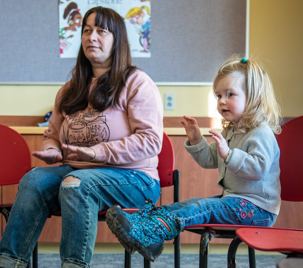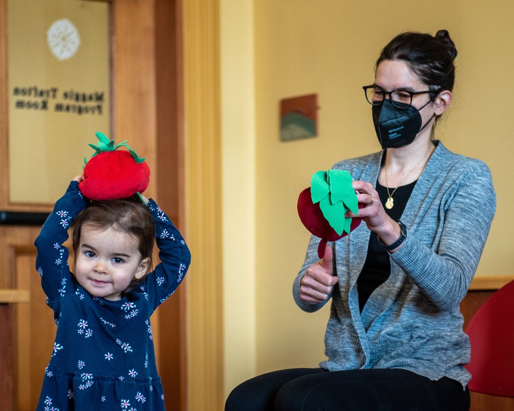 Amanda Burgess watches her daughter, Josephine Higgins, put a stuffed animal on her head Monday following the lead of Children’s Services Assistant Corinna Soucie at the Auburn Public Library in Auburn. The pair were attending the Tiny Tunes program and are regulars at many of the activities at the library. Russ Dillingham/Sun JournalLena Bartlett and her daughter, Griati, pat their legs during the Tiny Tunes program Monday morning at the Auburn Public Library in Auburn. “I used to come to this about 10 years ago with my son and just started again with Griati,” Bartlett said. Russ Dillingham/Sun JournalChildren’s Services Assistant Corinna Soucie touches her nose with a stuffed animal Monday morning as she leads a group of preschoolers and their parents in a song during the Tiny Tunes program at the Auburn Public Library in Auburn. Russ Dillingham/Sun Journal
