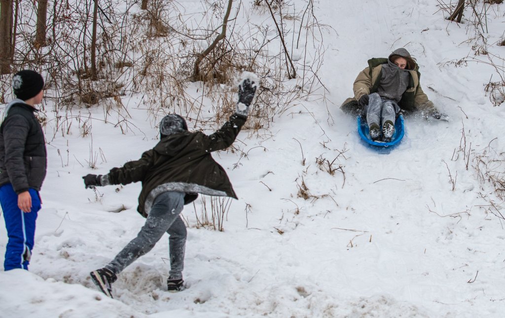 Logan Bloom, middle, throws a snowball at his friend, Jayden Pooler, right, as he slides down a hill Wednesday afternoon on Birch Street in Lewiston. Daniel Veneriel, left, waits for his turn as the three played around in the new snow that fell during the day while they were in school at Lewiston Middle School. Russ Dillingham/Sun Journal