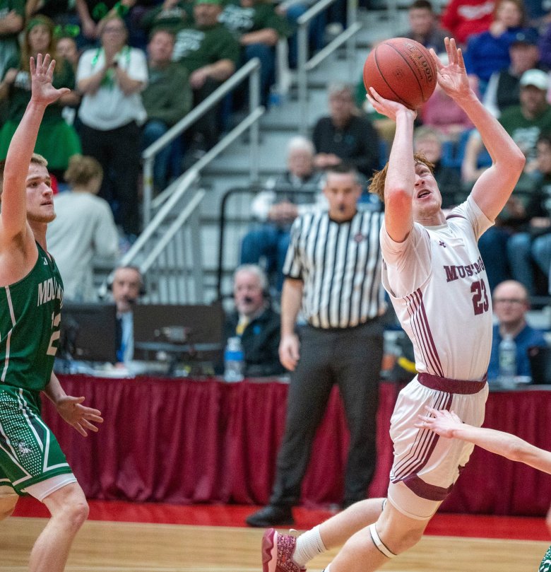 Monmouth and Mt. Abram battled until Lucas Harmon’s fourth-quarter heroics helped the Mustangs pull off a 46-43 victory to earn the school’s first boys basketball regional title.