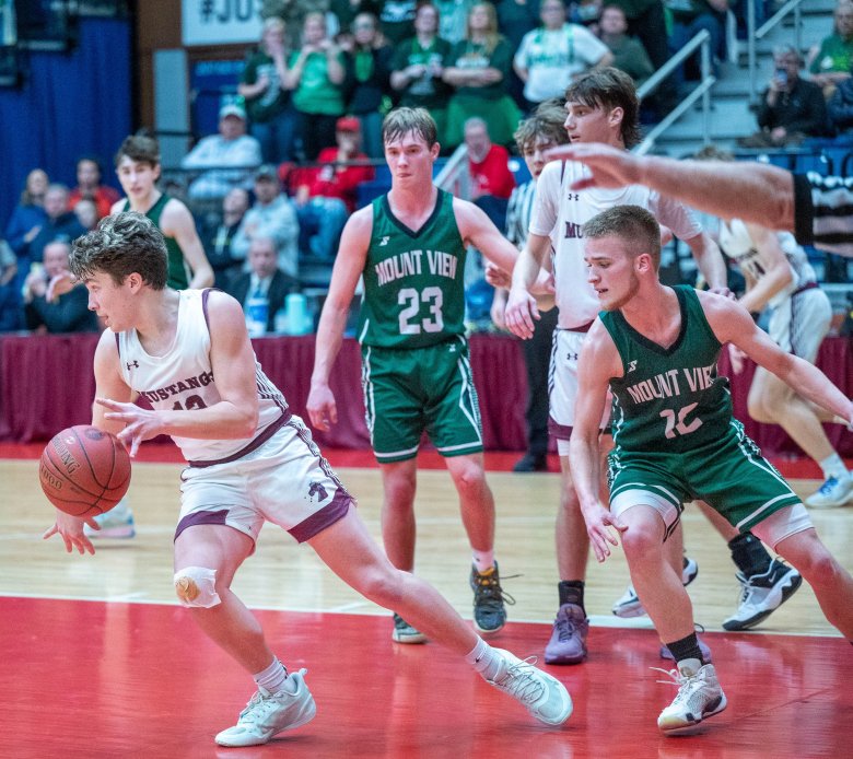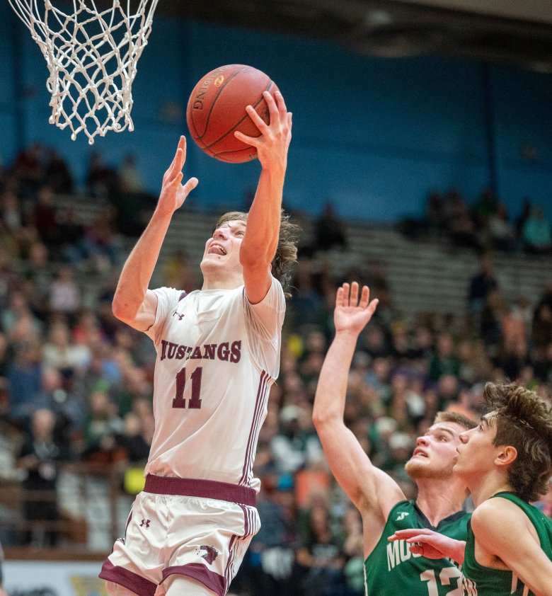 The Mustangs again fought back, and a late basket by Jacob Harmon got them within one point by the end of the first half.