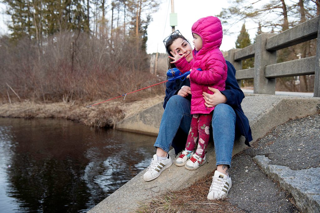 Michelle Curtis teaches her 3-year-old daughter, Raven Pelletier, how to fish Monday on the north end of Lake Auburn. “I remember my dad teaching me how to fish,” Curtis said. Daryn Slover/Sun Journal