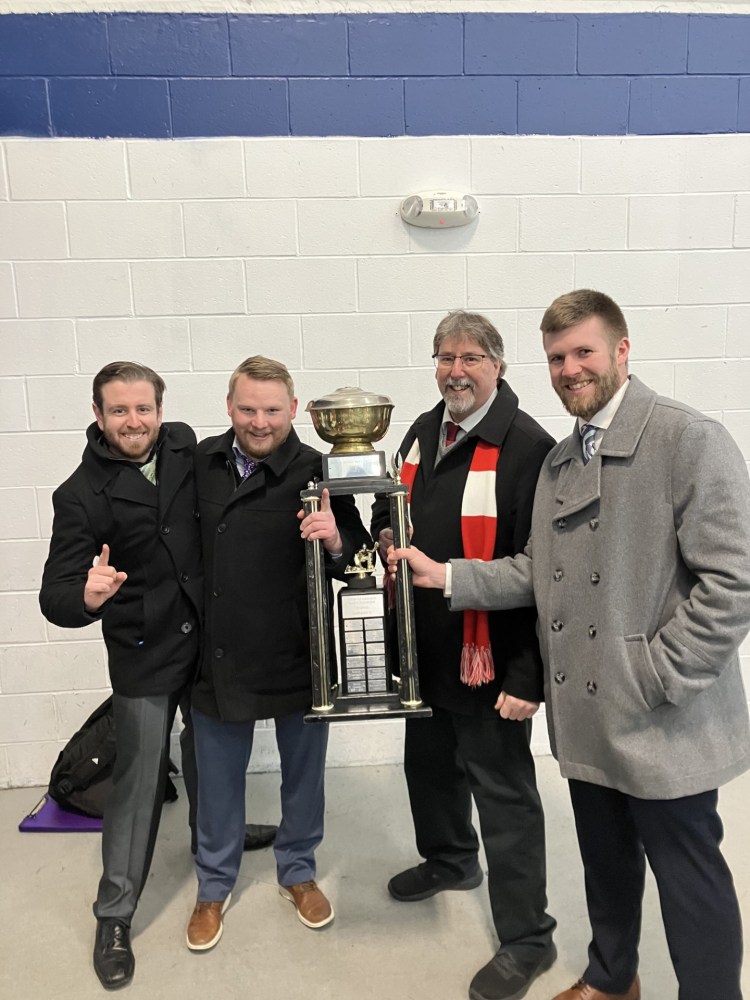 The Central Maine Community College men’s hockey team coaching staff celebrates after winning the NECHA Colonial Conference championship in Nashua, New Hampshire, on Feb. 18. From left are: assistant Dana Taylor-Fifield, head coach Jordy Knoren, assistant Jack Rioux and assistant Isaiah Dubois. Photo courtesy of CMCC Athletics