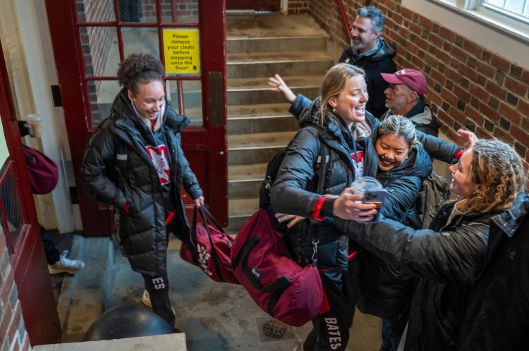 Bates College basketball player Elsa Daulerio, center, is hugged Thursday by Lauren Wong and Caroline Keating, right, of the lacrosse team at the college in Lewiston. The women’s basketball team is heading to the third round of the NCAA Division 3 Sweet 16 tournament for a game Friday at 5:30 p.m. at Rhode Island College in Providence. Andree Kehn/Sun Journal