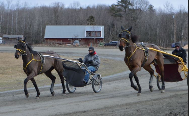 Mike Cushing, left, of Cushing Stable Farmington holds the reins Tuesday of Heart of Gold Devie while Steven Wilson exercises Alonso at the Farmington Fairgrounds track. Harness racing season begins at Cumberland Fairgrounds on April 12, according to firstrackscumberland.com. Donna M. Perry/Sun JournalMike Cushing, left, of Cushing Stable Farmington holds the reins Tuesday of Heart of Gold Devie while Steven Wilson exercises Alonso at the Farmington Fairgrounds track. Harness racing season begins at Cumberland Fairgrounds on April 12, according to firstrackscumberland.com. Donna M. Perry/Sun Journal