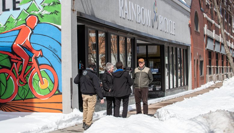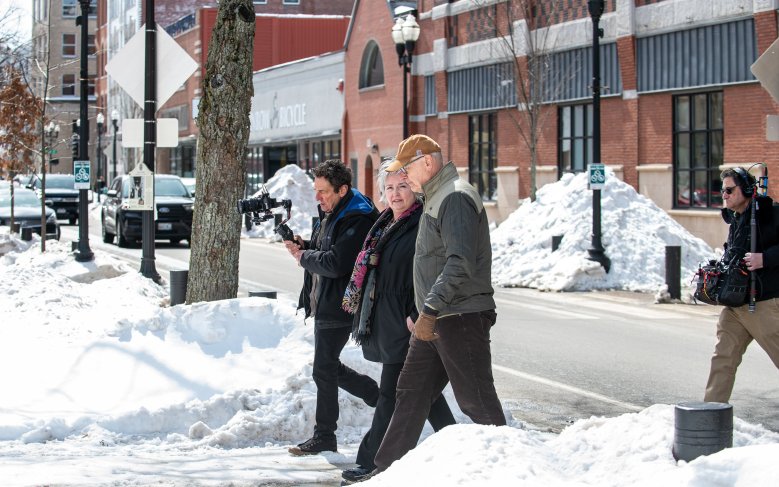 An NBC film crew walks with veteran television journalist Harry Smith Monday morning as he interviews Sun Journal Publisher Jody Jalbert in downtown Lewiston. NBC News is doing a story on the critical impact of local journalism on communities across the country and the movement toward nonprofit newsrooms. The segment is scheduled to run Thursday on the NBC Nightly News with Lester Holt.