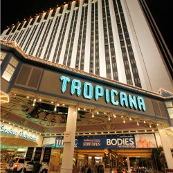 Today, only the low-rise hotel room wings remain of the original Tropicana structure. Yet the casino still conjures up vintage Vegas nostalgia.