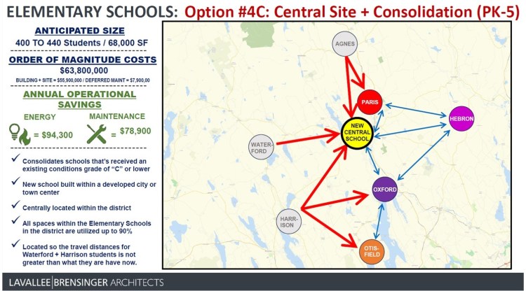 At a March 28 workshop, the Maine School Administrative District 17 board heard scenarios and recommendations for elementary school construction from LaVallee Brensinger, an architectural firm in Portland. Its 32-page report can be downloaded from MSAD 17’s school construction website. It lists four options: