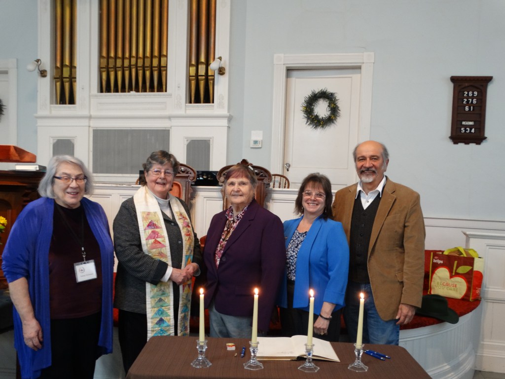 The congregation of the First Universalist Church of Norway welcomed three new members on Easter Sunday. From left are Church Board President Joanne McDonald, Rev. Fayre Stephenson, and new members Kay Hawkins, Virginia McKinstry and Gary McKinstry. Submitted photo