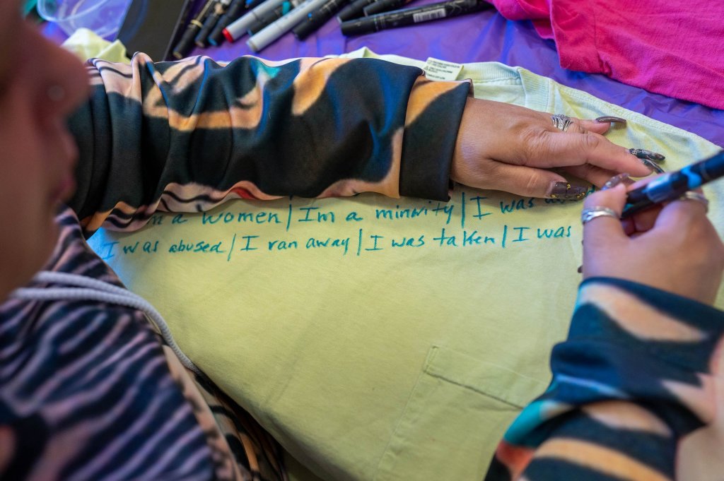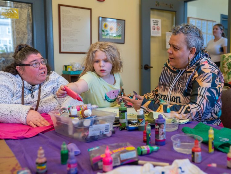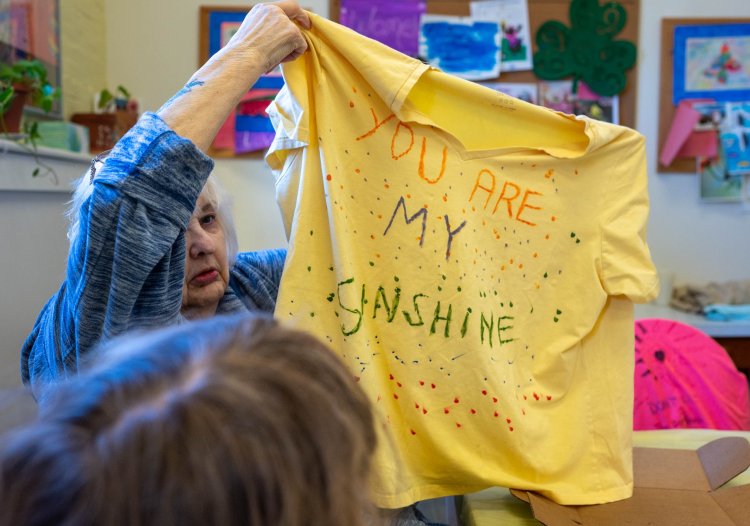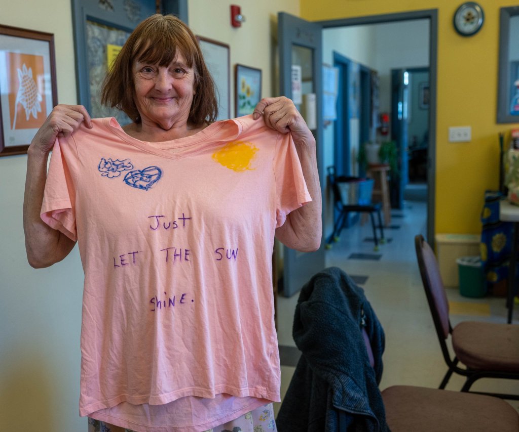 Sue Coker displays the T-shirt she created Thursday at the Center for Women’s Wisdom at 97 Blake St. in Lewiston in collaboration with Operation You Matter. Her shirt will be featured as part of the Clothesline Project, where each collection of clothing is decorated to represent a particular theme. In this case, the theme is offering encouragement to other women. The shirts will be showcased at Chill Yoga during Art Walk LA in June. Andree Kehn/Sun JournalAnn Boswell displays the T-shirt she created Thursday at the Center for Women’s Wisdom at 97 Bates St. in Lewiston in collaboration with Operation You Matter. Her shirt will be featured as part of the Clothesline Project, where each collection of clothing is decorated to represent a particular theme. In this case, the theme is offering encouragement to other women. These shirts will be showcased at Chill Yoga during Art Walk LA in June. Andree Kehn/Sun JournalSonia Bermonty works Thursday on a T-shirt as part of the Clothesline Project, a collaboration between the Center for Wisdom’s Women in Lewiston and Operation You Matter. The shirts will be showcased at Chill Yoga during Art Walk LA in June, featuring themes of empowerment for women and personal histories. Bermonty, who recently shared her story of being sex-trafficked when she was younger, credits the center with supporting her as she navigated the challenging task of revealing something she had kept secret for decades. “The center has been helping me embrace my truth,” she said. Andree Kehn/Sun JournalSonia Bermonty, right, and Sherri Swan, left, discuss the Clothesline Project on Thursday during a shirt-making session at the Center for Wisdom’s Women at 97 Bates St. in Lewiston. Zareena Warren, 7, selects a new color for her shirt. The project, a collaboration between the Center for Wisdom’s Women and Operation You Matter, focuses on messages of encouragement to women and personal histories. Zareena’s mother, Linda (not shown), said she brought her daughters as a “step in the right direction, so they can have a better life without trauma.” Andree Kehn/Sun Journal