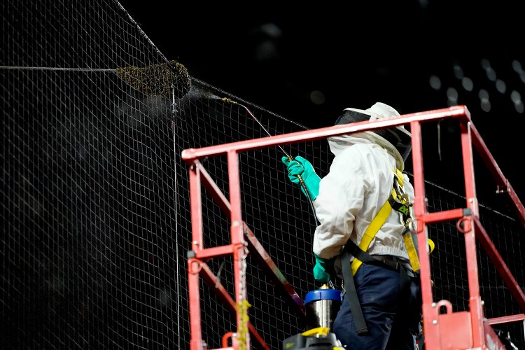 Beekeeper Matt Hilton removes a swarm of bees gathered on the net behind home plate, delaying the start of Tuesday night’s game between the Dodgers and Diamondbacks in Phoenix. Matt York/Associated Press