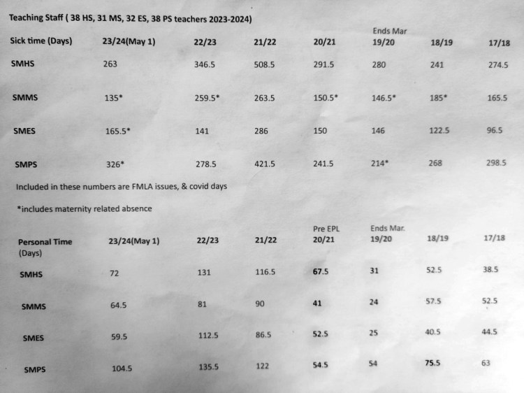 Albert shared a document detailing staff’s sick time and personal time off for the last six years and through May 1 this year. He noted three teachers at the primary school and one at the elementary school were out on maternity leave this year. Included in the numbers were FMLA issues [surgery, etc.] and COVID-19 days, he said.