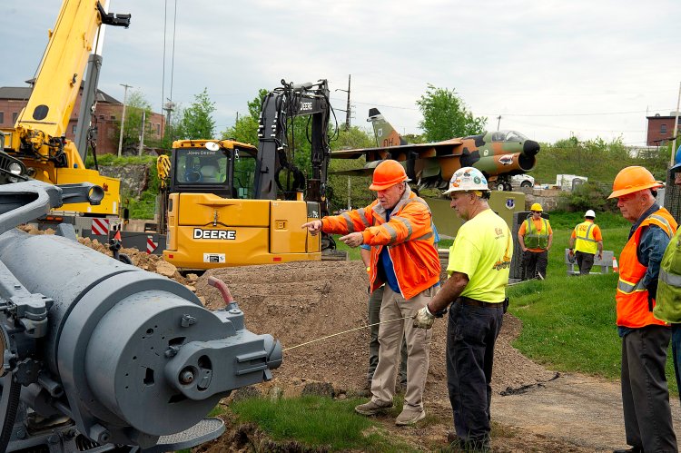 Jerry DeWitt of the L&A Veterans Council talks Wednesday with Todd Belaire of The Cote Corporation as work begins to lift a 51mm Naval gun by crane at Veterans Memorial Park in Lewiston. Employees from Cote and the city of Lewiston worked together to make repairs after the park sustained heavy damage during a December 2023 flood. Daryn Slover/Sun Journal