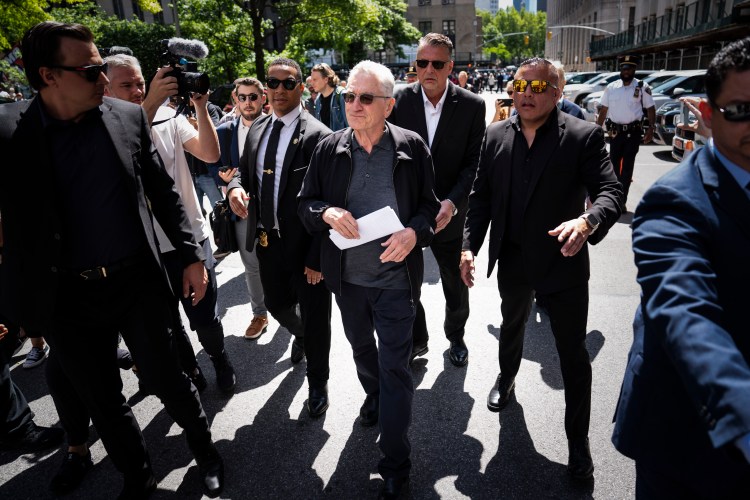 De Niro spoke over profane taunts and chants from Trump supporters demonstrating in the neighboring park, calling them “crazy” and a sign of the chaos that Trump sows.