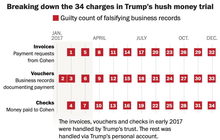 The jury seems to have done that, finding Trump guilty on all 34 counts of falsifying business records. At the heart of the prosecution’s case against Trump were 34 documents: 11 invoices, 12 vouchers and 11 checks. Each of these documents accounted for one of the charges on which Trump was found guilty.