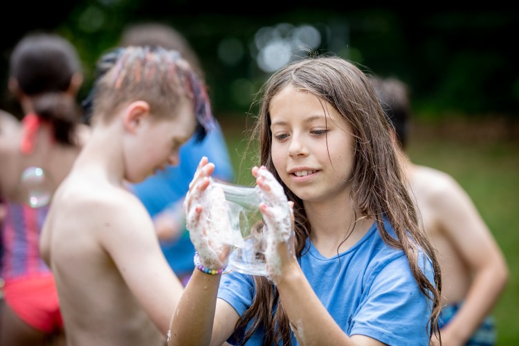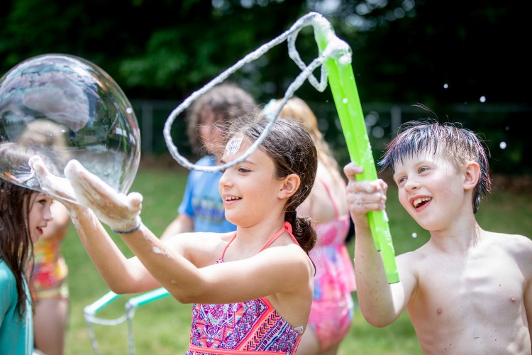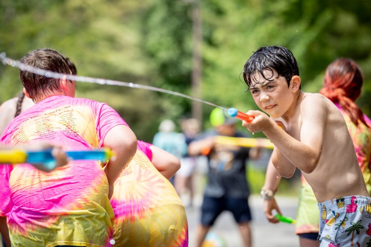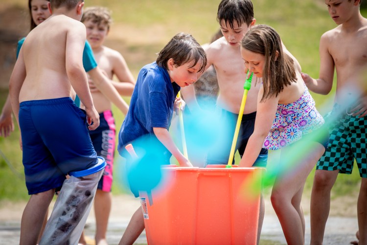 BETHEL — Water guns-a-blazing, Crescent Park School students doused each other with water at a water-themed end to their field day. Groups of students visited stations manned by teachers and high school volunteers. They slipped and slid down a hill of wet bubbles; used their feet to lift objects from kiddie pools and made giant bubbles.