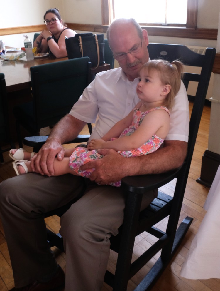 A retirement/open house was held Thursday afternoon in Rumford Falls Auditorium on Stacy Carter’s final day as Rumford town manager. Carter, who served the town for nearly 35 years, received a rocking chair as a retirement gift. He quickly put it to good use, rocking with his two-year-old granddaughter, Sianna Laurinaitis. Behind them is Rumford Exec. Asst. Mariya Gorham, who ordered the chair with the name plate on the back that read Retired King Carter 2024. Bruce Farrin/Rumford Falls Times
