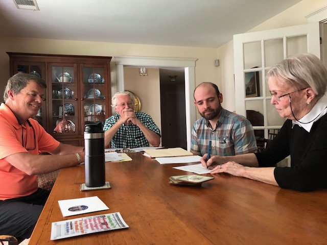 Andrea Burns of Norway Landmarks Preservation, right, and Brad Miller of Maine Preservation, second to right, sign the preservation easement agreement for the Gingerbread House. The easements will protect the historic integrity of the exterior of the Gingerbread House, monitored in perpetuity, by Maine Preservation. L. to R. David Dow of Dow Law Office, Richard McSherry of Norway Landmarks Preservation Society, Brad Miller of Maine Preservation, and Andrea Burns of Norway Landmarks Preservation Society. Submitted