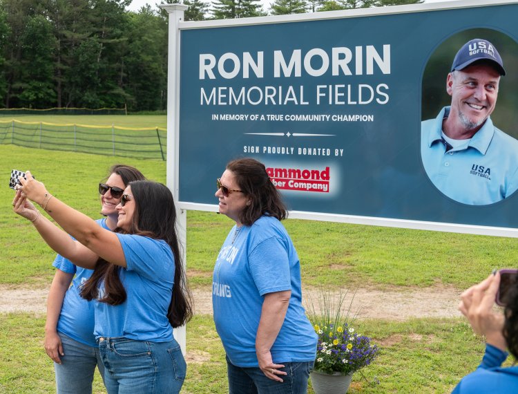 Family and friends of Ron Morin gather Saturday morning in front of a sign that was unveiled at the former Randall Road Softball Complex in Lewiston, which was renamed in honor of Morin who was killed in last year’s mass shooting in Lewiston. Morin was an avid athlete who passionately engaged in ice hockey, softball, cornhole and often frequented the fields as a player, coach, spectator, umpire and mentor to young athletes. Russ Dillingham/Sun JournalAllyson Morin, second from left, takes a selfie with her mother-in-law, Lynn Morin, right, and Amy Puciaty, daughter of Ron Morin, who was honored Saturday morning at the former Randall Road Softball Complex in Lewiston. The complex was renamed in honor of Morin, who was killed in last year’s mass shooting in Lewiston. Ron Morin was an avid athlete who passionately engaged in ice hockey, softball, cornhole and often frequented the fields as a player, coach, spectator, umpire and mentor to young athletes. Russ Dillingham/Sun Journal
