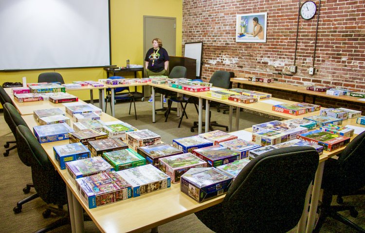 Lewiston Public Library worker Caitlin Ramsay stands Wednesday over tables of puzzles that are ready to be swapped in Lewiston. This is an event open for anyone of all ages to swap and enjoy puzzles together. Emma Meserve photoLewiston Public Library worker Caitlin Ramsay stands Wednesday over tables of puzzles that are ready to be swapped in Lewiston. This is an event open for anyone of all ages to swap and enjoy puzzles together. Emma Meserve photo
