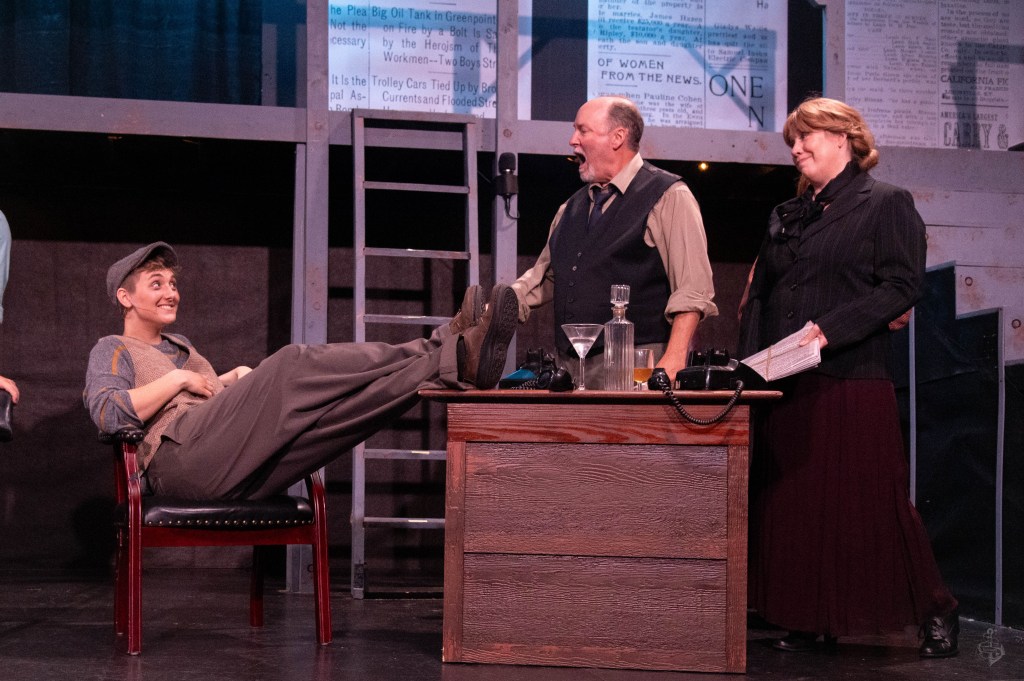 Returning veterans, most in multiple roles, were Ben Wetherill, Anne Crump, Debby Higgins, Kaitlyn Hammon, Ana Orazi, and Troy Hathaway. Averie Flewelling and Stella MacFawn brought their many years of dance experience with them as they tore up the stage as newsies and Bowery Beauties. The multi-talented Micha Beckman not only morphed from her four assigned roles but she also stood in for an ailing Erin Smith at the Sunday matinee, singing Medda’s “That’s Rich” and memorizing all of her dialogue in mere hours. That’s tough.