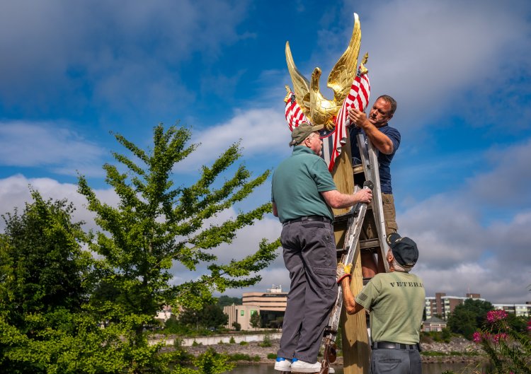 A hand-carved wooden eagle is erected Monday at Veterans Memorial Park on Main Street in Lewiston. Created by artist Matthew Carr of Matthew Carr Woodworks of Pennsylvania, the sculpture is made of mahogany and adorned with 23 carat gold leaf. It was inspired by a historic John Haley Bellamy design. The gift is a joint venture by Carr and the Maine nonprofit Eagles for Veterans to honor the service of veterans whose names are memorialized on nearly three dozen granite monuments at the park. Andree Kehn/Sun JournalMatthew Carr installs his hand-carved gilded eagle Monday at Veterans Memorial Park on Main Street in Lewiston. Paul Farley, left, and Paul St. Clair, holding the ladders, assist Carr, owner of Matthew Carr Woodworks of Pittsburgh. The gift is a joint venture by Carr and the Maine nonprofit Eagles for Veterans to honor the service of veterans whose names are memorialized on nearly three dozen granite monuments at the park. James McCain, a director of Eagles for Veterans, attended the ceremony. Andree Kehn/Sun Journal