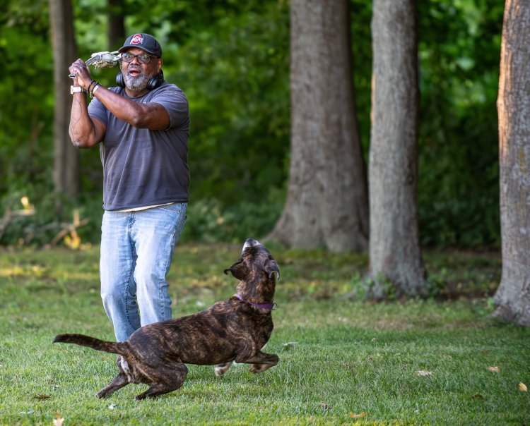 Ken Allen winds up to throw a tennis ball Thursday evening to his dog Moose at George F. Ricker Memorial Park in Lewiston. “We come here most every day, and sometimes twice a day. A friend of mine gave me this lacrosse stick to use. I was throwing my arm out,” Allen said. Russ Dillingham/Sun Journal