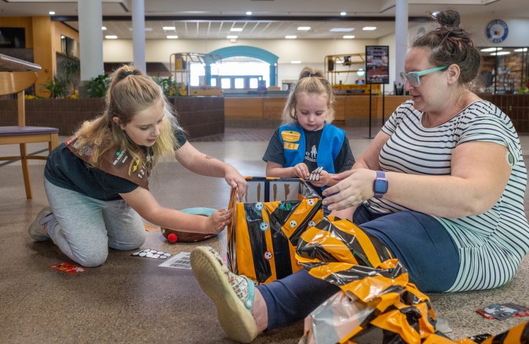 Raychel Ward of Livermore Falls helps her daughters, Ashliee, 9, left, and Winter, 5, decorate a donation box on Wednesday at the Auburn Mall. Ward leads Girl Scout Troop 1210, which meets weekly at the mall. The troop is collecting hygiene supplies in coordination with Auburn-based Salt & Light Community Center for people without housing. “Kids are often told, ‘This is not your problem, you’re just a kid,'” Ward said. “This gives them an opportunity to help while still feeling safe.” People wishing to donate hygiene supplies can drop them off at Nerdcore in the Auburn Mall or contribute funds directly to Salt & Light through its Facebook page. Andree Kehn/Sun Journal