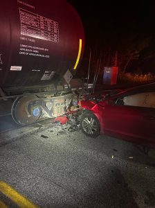 Novach’s vehicle collided with the rear of the black tanker car, police said, causing damage to both the train and the car. Novach’s vehicle sustained disabling damage and was towed from the scene.