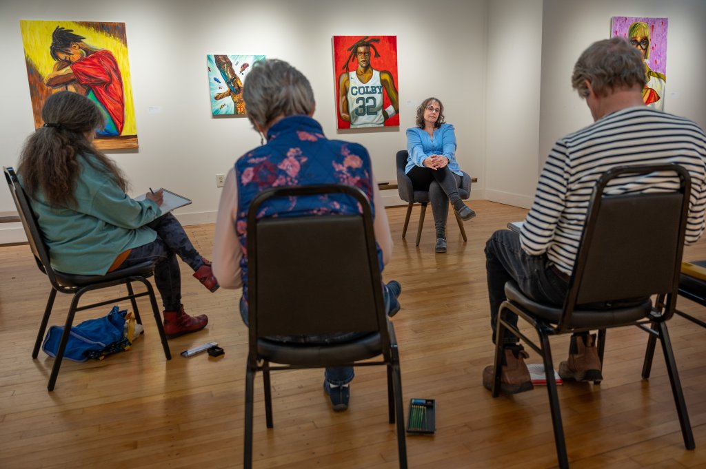Mary Callahan, facing the camera, poses Monday evening for the Sketchy Friends drawing group at LA Arts on Lisbon Street in Lewiston. From left are Karen Brooks, Ellie Garcia and Noel Smith. Sketchy Friends is a free workshop where participants take turns modeling for 12-minute sessions for their fellow artists. Callahan said, “Modeling has made me more adaptable in how I draw the figure. When you try to sit still, your body starts to move in little ways. It’s made me more adaptable in how I draw, anticipating those little movements.” Sketchy Friends usually meets the first Monday of every month. Details of each session can be found on their Facebook page. Andree Kehn/Sun Journal