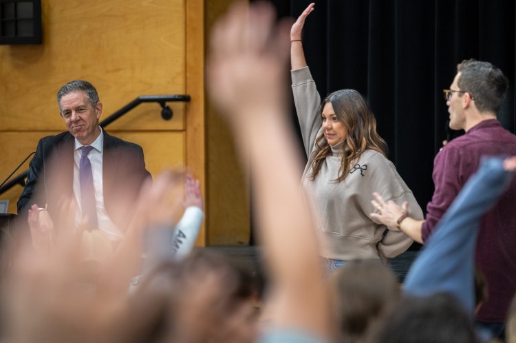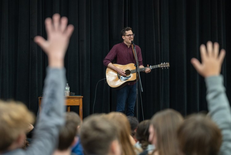 Saint Dominic Academy teacher Romolo Marcoccio, left, reacts Monday morning to the Auburn school’s support of his longtime goal of becoming a rock star and public performer. Teachers were asked by singer-songwriter Jesse Ruben, right, to share unfulfilled dreams and encourage them set measurable goals. Students were invited to ask teachers about progress on their goals. Amanda Hammond, center, previously committed to attending line dancing classes Monday evenings and students were given permission to ask her about her progress every Tuesday morning. Ruben’s We Can Project is an initiative inspired by his song “We Can” that focuses on empowering individuals, especially children, to make a positive impact in their communities and the world. Andree Kehn/Sun JournalJesse Ruben, a singer-songwriter who partners with schools to encourage students to believe in their potential and take steps to help others, sings Monday to students at Saint Dominic Academy at 151 Gracelawn Road in Auburn. His We Can Project explores themes of empathy, kindness and confidence. Students raise their hands in response to the song “Raise Your Hands” if they agreed with parts that asked if they have ever felt lonely or sad, before pivoting to ask if they still have hope. Andree Kehn/Sun Journal