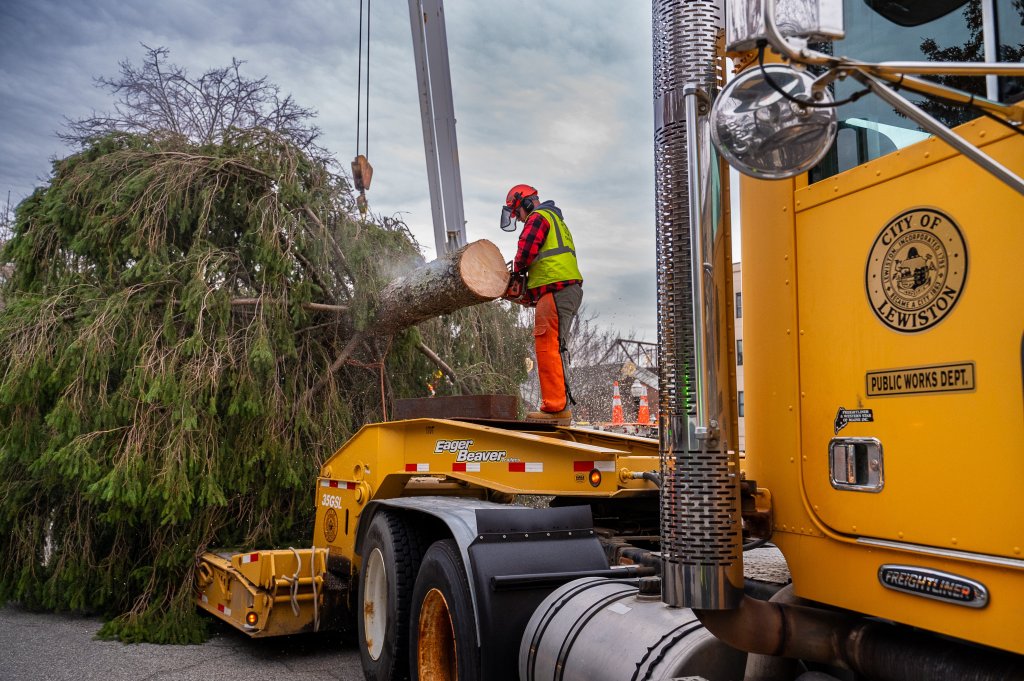 Lewiston city arborist Steve Murch counts the rings Tuesday morning on a Norway spruce that was just cut before being transported to Dufresne Plaza in downtown Lewiston. “I count 40 rings,” he said. The 46-foot Christmas tree will be the backdrop for the city’s Holiday Extravaganza from 11:30 a.m. to 5 p.m. Dec. 7. Russ Dillingham/Sun JournalLewiston city arborist Steve Murch counts the rings Tuesday morning on a Norway spruce that was just cut to be transported to Dufresne Plaza in downtown Lewiston. “I count 40 rings,” he said. The 46-foot Christmas tree will be the backdrop for the city’s Holiday Extravaganza on Dec. 7 from 11:30 a.m. to 5 p.m. Russ Dillingham/Sun JournalLewiston Public Works’ utility arborist Caelan Pelletier drives the wrong way on Park Street Tuesday morning with the city’s Christmas tree to Dufresne Plaza between Park and Lisbon streets. The 46-foot Norway spruce will be the backdrop for the city’s Holiday Extravaganza from 11:30 a.m. to 5 p.m. Dec. 7. Russ Dillingham/Sun JournalLewiston Public Works’ utility arborist Caelan Pelletier uses a long pole early Tuesday morning to move a giant tarp into place over the city’s Christmas tree that was just cut and placed on a trailer at the corner of Commercial Street and Ferry Road in Lewiston. The tarp helps keep the branches in place and compresses it as it is transported to Dufresne Plaza in downtown Lewiston. Russ Dillingham/Sun JournalLewiston Public Works employee Tiffany Burgess watches the city’s Christmas tree being lifted into place Tuesday morning at Dufresne Plaza in downtown Lewiston. Russ Dillingham/Sun JournalLewiston Public Works’ utility arborist Caelan Pelletier drives Tuesday morning down Lisbon Street with the city’s Christmas tree on its way to Dufresne Plaza between Park and Lisbon streets. Unlike years past when the convoy had to stop and lift utility wires at intersections, the convoy sailed through the city this year. The tree was hoisted into place just before rain began to fall. Russ Dillingham/Sun JournalLewiston Public Works’ utility arborist Caelan Pelletier squares off the base of the city’s Christmas tree before it is lifted into place at Dufresne Plaza between Park and Lisbon streets. Russ Dillingham/Sun JournalLewiston Public Works employee Tiffany Burgess cuts rope Tuesday morning from the city’s Christmas tree that was lashed down for transportation to Dufresne Plaza in downtown Lewiston. Russ Dillingham/Sun JournalLewiston’s city arborist Steve Murch measures the base of a 46-foot Norway spruce Tuesday morning before it is placed on its pedestal at Dufresne Plaza in downtown Lewiston. Russ Dillingham/Sun JournalLewiston Public Works’ utility arborist Caelan Pelletier maneuvers his bucket Tuesday morning to place one of several support cables that will help secure the city’s Christmas tree at Dufresne Plaza between Park and Lisbon streets. Russ Dillingham/Sun JournalLewiston Public Works employees Danny May, left, and Mike St. Pierre string lights Dec. 2 on the city’s Christmas tree at Dufresne Plaza between Park and Lisbon streets in Lewiston. The city is preparing for its Holiday at The Plaza extravaganza Saturday from 11:30 a.m. to 5 p.m. Russ Dillingham/Sun Journal
