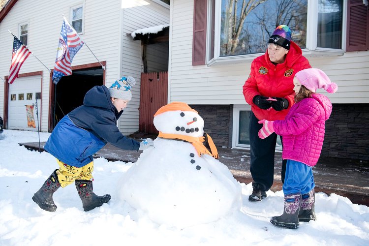 Two Amish men ride in a horse-drawn carriage Friday along Leeds Junction Road in Wales. About 4 inches of snow fell on the town on Thanksgiving Day. Daryn Slover/Sun JournalMary Jo Hodgkin helps her grandchildren, Jack and Tatyana Cooper, build a snowman Friday at Hodgkin’s home in Leeds. About 4 inches of snow fell on the town on Thanksgiving Day. Daryn Slover/Sun Journal
