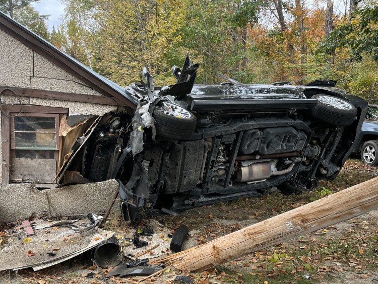 An SUV lies on its side Oct. 3 after it went off Route 219, broke a utility pole and smashed into the main entrance of Herbert and Marilyn Stevens’ home on Route 140 in Hartford. In February, another vehicle struck their house, heavily damaging the bathroom. The older couple has been living in the kitchen and bathroom, has no home insurance or help from the insurers for the Canadian and German drivers to make repairs, Marilyn said. Tanya Walsh photo