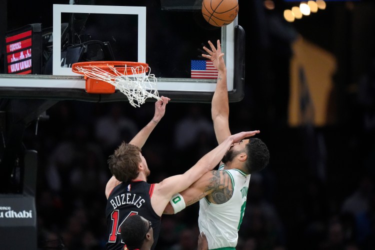 The Celtics made 14 3-pointers to end the Bulls’ three-game streak of holding opponents under 10.