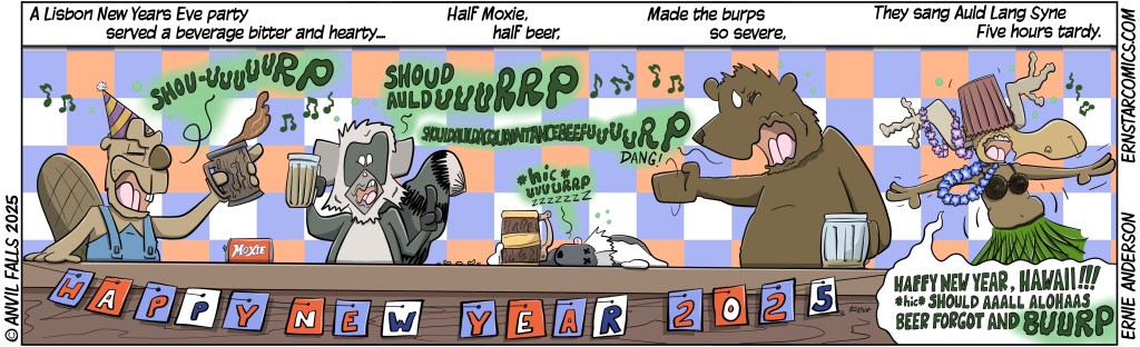Ernie Anderson is an award-winning cartoonist and the creator of Anvil Falls — which has been running in the Sun Journal on Sundays since February 2023. He got his start in newsprint media in Maine in 2012, producing editorial cartoons and illustrations for the Sun Journal, and in 2014 and 2015 his cartoons took first place at the Maine Press Association’s Better Newspaper Contest. Since 2022, he has illustrated Mark LaFlamme’s Talk of the Town column.