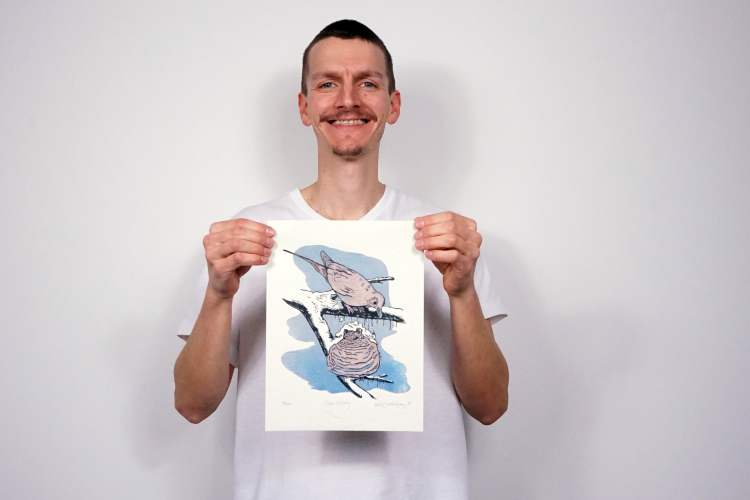After he graduated, he began working at a community printing shop in Massachusetts. This was when he started to be known for his large wooden block prints, illustrations made from carving images into wood, applying ink, and making impressions on paper like a stamp. While there, everyone shared equipment and processes and Castonguay began teaching others. He soon realized that for him, teaching was a sustainable way to live off of his passion while also having time to create art for himself.