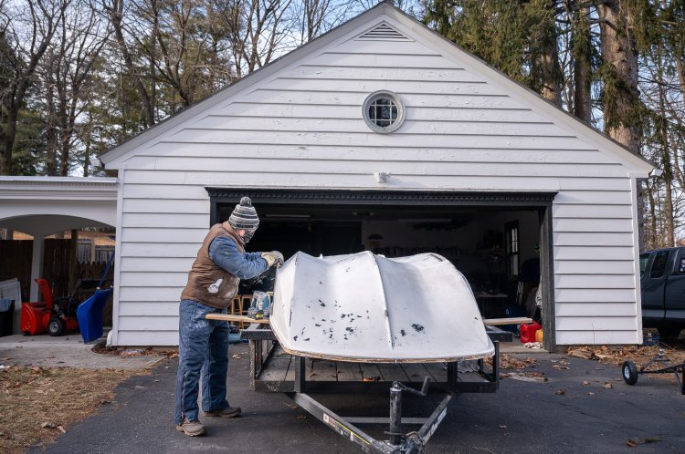 Doug Weber sands the hull of his 1967 Boston Whaler 13 SuperSport, a collectible boat known for being unsinkable, Wednesday at his home in Auburn. “This is something I can do outdoors,” he said. Gesturing to two other boats under wraps along the side of his garage, he added, “I’ve got a problem when it comes to boats.” Weber uses them in the summer at his camp on Cathance Lake in the Washington County town of Cooper. Andree Kehn/Sun Journal